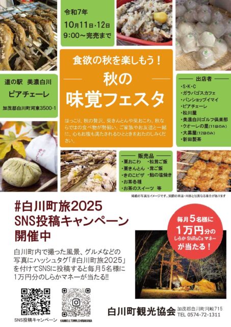 明日からの2日間(10/11~10/12)に道の駅美濃白川で≪秋の味覚フェスタ≫が開催されます。